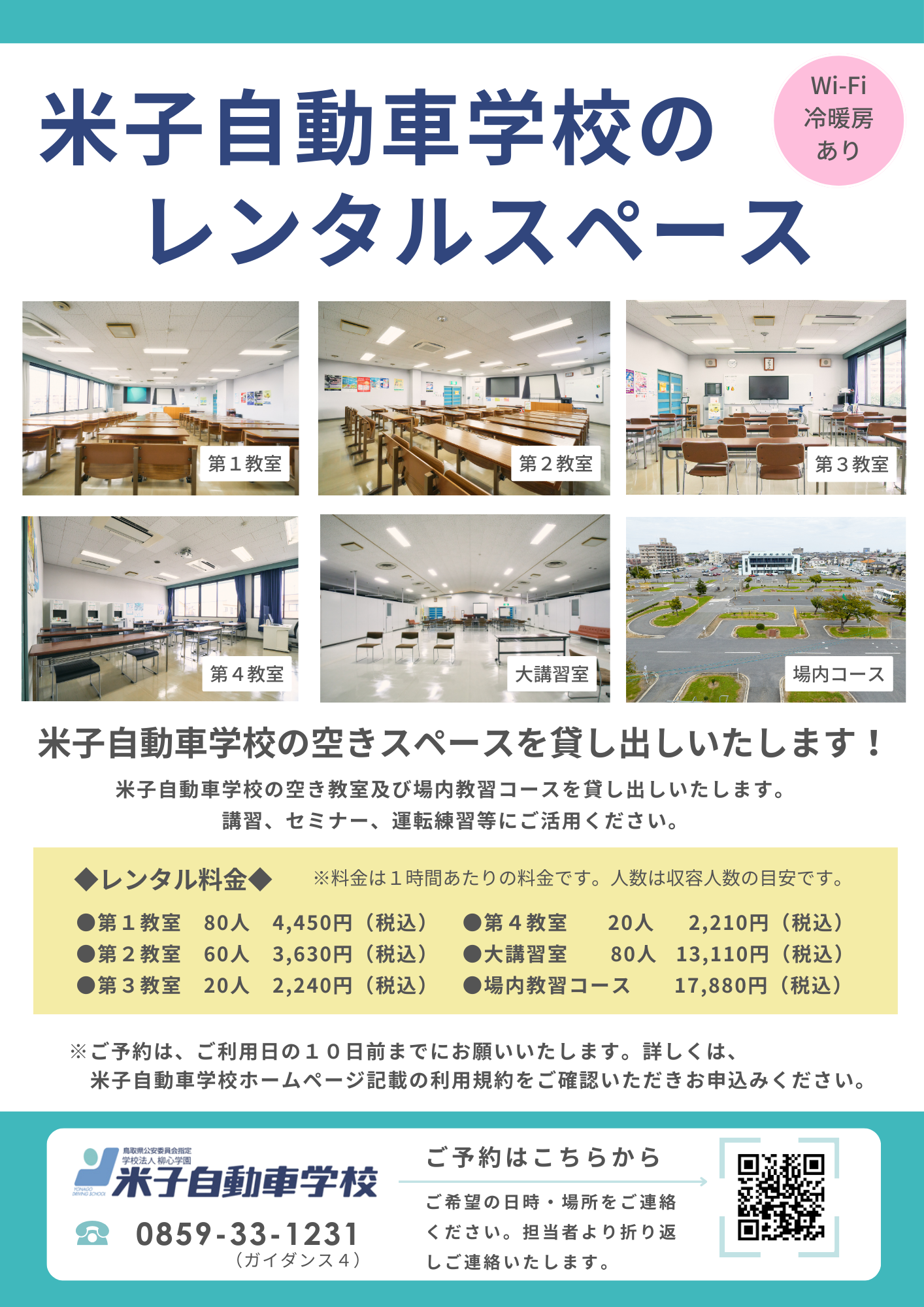 この度、米子自動車学校校舎内の空き教室及び場内教習コースのレンタルスペース事業を開始いたしました。